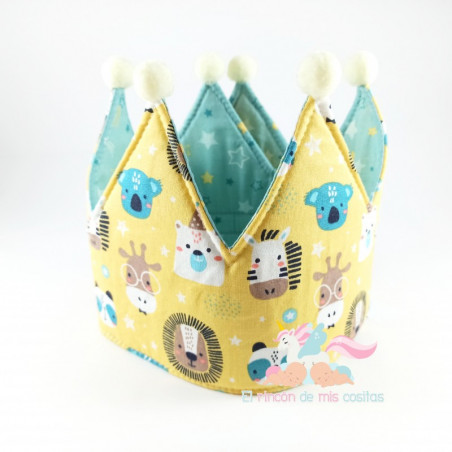 Corona de cumpleaños hecha a mano con telas 100% algodón. La medida se regula con velcro, por lo que sirve para varios años. Si no estas seguro de que el tamaño le sirva al peque, puedes ponernos la medida del contorno de la cabecita en observaciones del pedido, y así lo tendremos en cuenta.