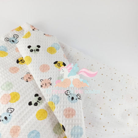 Está hecha por una cara de tejido waffle y por la otra suave muselina de color blanco con puntitos dorados.