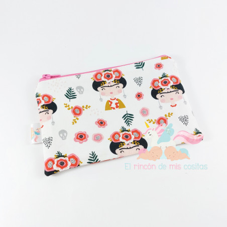 Neceser pequeño tipo estuche, hecho con telas 100% de algodón, forrado en el interior y cierre de cremallera.