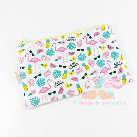 Neceser pequeño tipo estuche, hecho con telas 100% de algodón, forrado en el interior y cierre de cremallera.