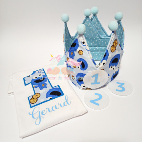 La camiseta personalizada es blanca de algodón, y puedes escoger manga larga o corta. El diseño esta formado por el número de tela a juego de la corona. También se puede personalizar con el nombre del peque.