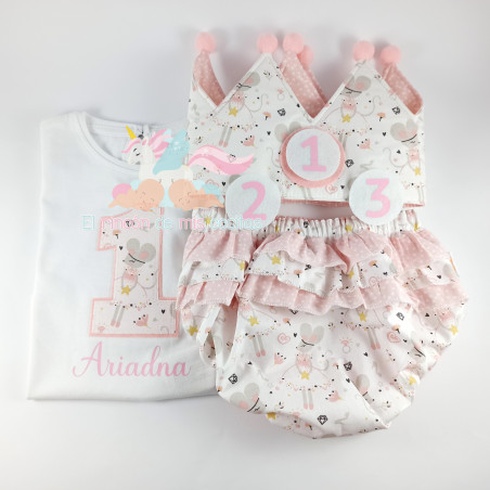 Pack de cumpleaños con camiseta, corona y cubrepañal con volantes a juego.